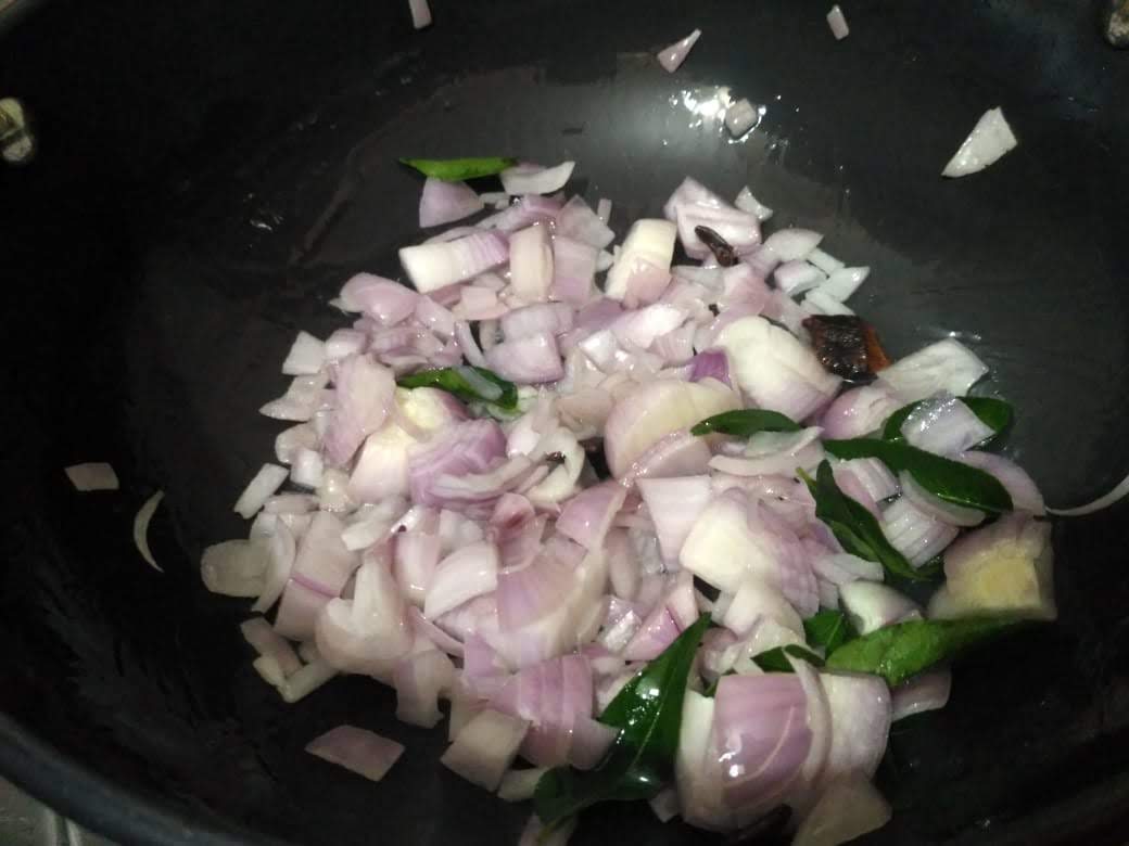 2. Heat oil in a kadai. Add cinnamon and cloves. After it crackle, add chopped onion and curry leaves. saute until it becomes soft.