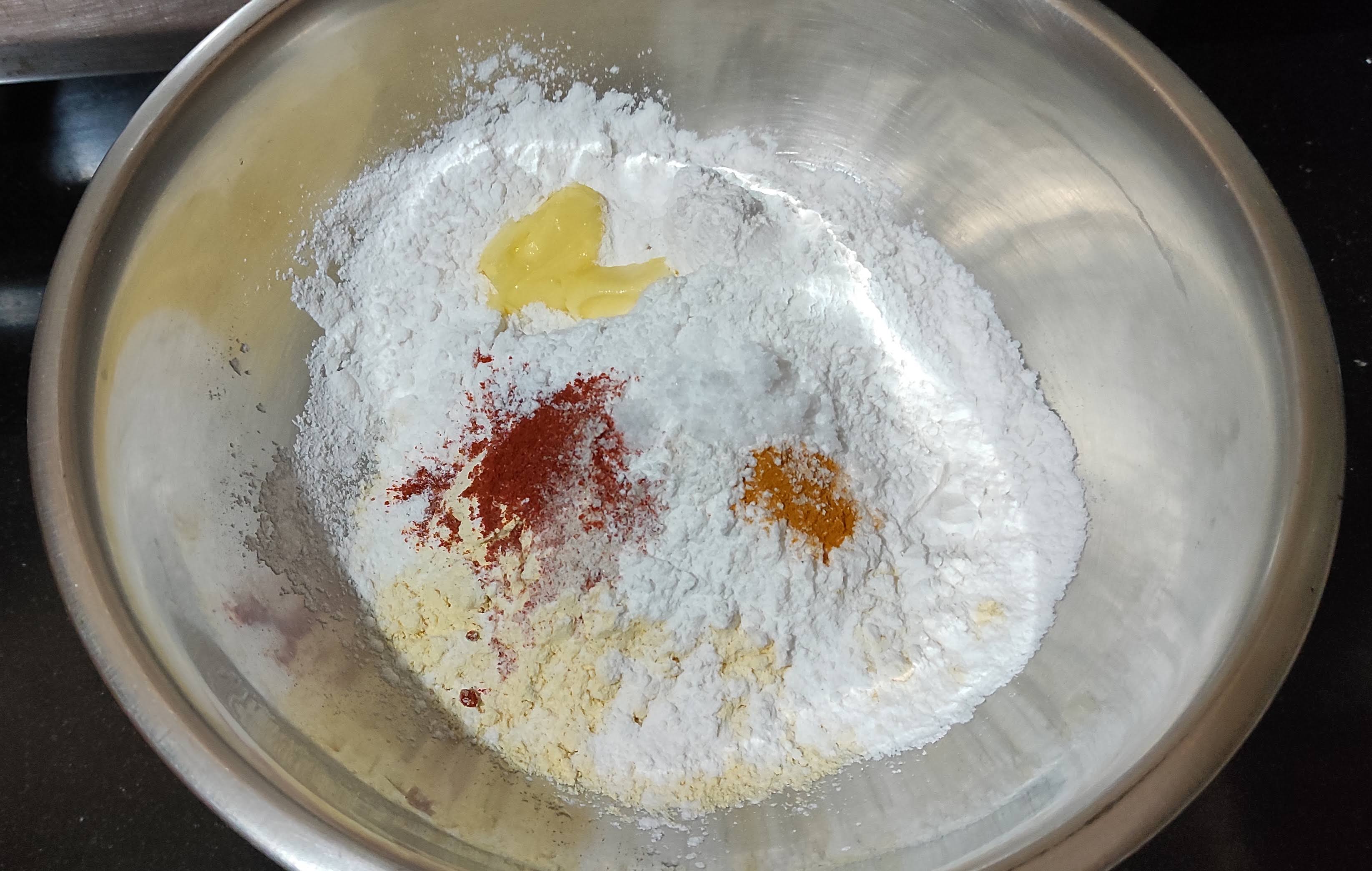 1. Take gram flour and rice flour in a bowl. Add turmeric powder, chilli powder, butter, hing and salt.